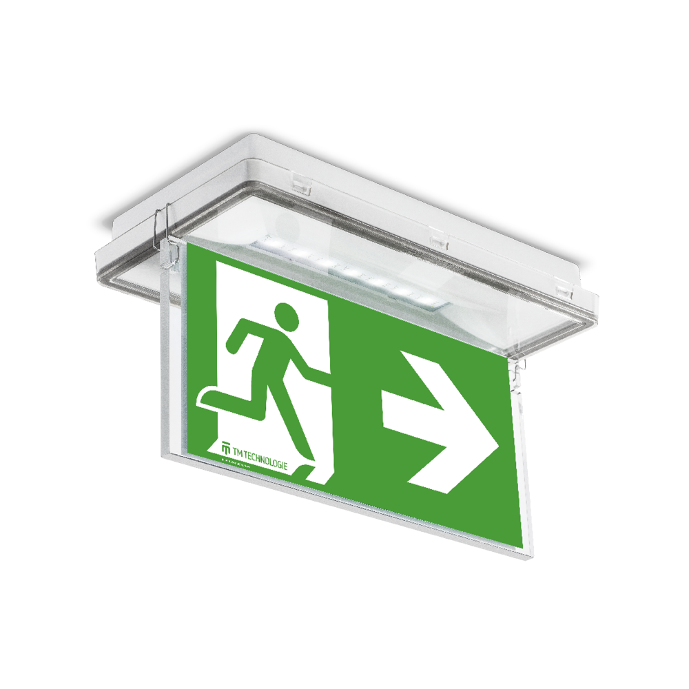 - die Möglichkeit, die Fluchtrichtung anzuzeigen - die Leuchte wird mit einem Satz von Fluchtschildern zum Aufkleben geliefert, die in verschiedenen Kombinationen verwendet werden können