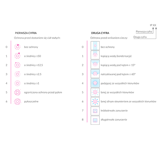 Stopień szczelności to parametr techniczny oprawy oświetleniowej dotyczący ochrony przed czynnikiem ciał stałych i przed wnikaniem cieczy do wnętrza oprawy. Produkujemy aż 4 typy opraw: IP20, IP44, IP65, IP67. Zapewniają one największy poziom bezpieczeństwa, niezależnie od przestrzeni, w jakiej ma być zamontowana oprawa. Oznaczenie stopnia szczelności składa się z dwóch cyfr. Interpretuje się je zgodnie z poniższą tabelą.