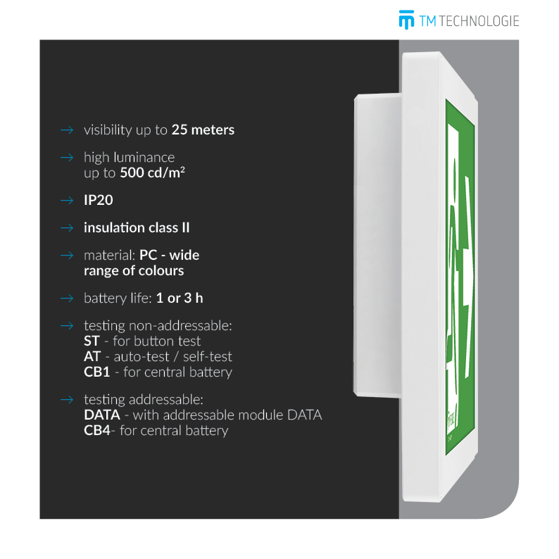💡 ONTEC E is the next edition of discreet and effective emergency lighting. Represents a group of luminaires intended for lighting signs indicating the route of escape and designating places for fire-fighting devices. The luminance factor reaches up to 500 cd / m², and the use of advanced lighting technology solutions allows evacuation signs to be visible from a distance of 25 m.